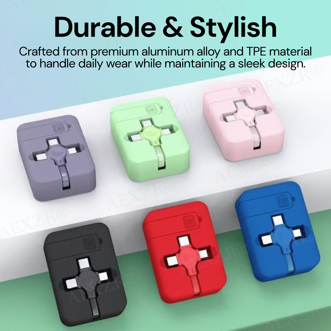 Its retractable, roll-up design keeps cables organized and knot-free, while the adjustable length gives you the flexibility to charge comfortably, whether you're working at your desk, lounging at home, or commuting. Plus, the built-in phone stand transforms it into the perfect hands-free companion for watching videos or video calling on the go. Lightweight, durable, and pocket-sized, the AEXZR® cable roll delivers fast charging, efficient data transfer, and total convenience—all in one sleek, compact device. It’s more than just a cable—it’s your everyday charging essential.